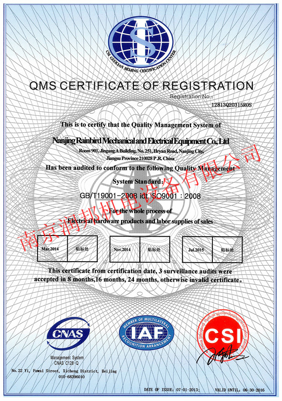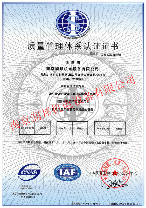 2013年7月1日,我公司順利通過ISO9001質量管理體系認證,并獲取以下證書: