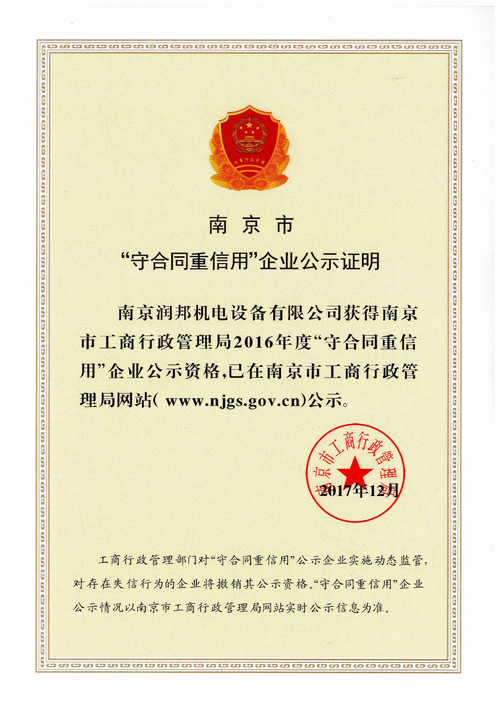 2017年12月29日,接到南京市企業(yè)信用管理協(xié)會(huì)通知,潤(rùn)邦公司再次通過(guò)2016年度市級(jí)“守合同重信用”企業(yè)的認(rèn)定。